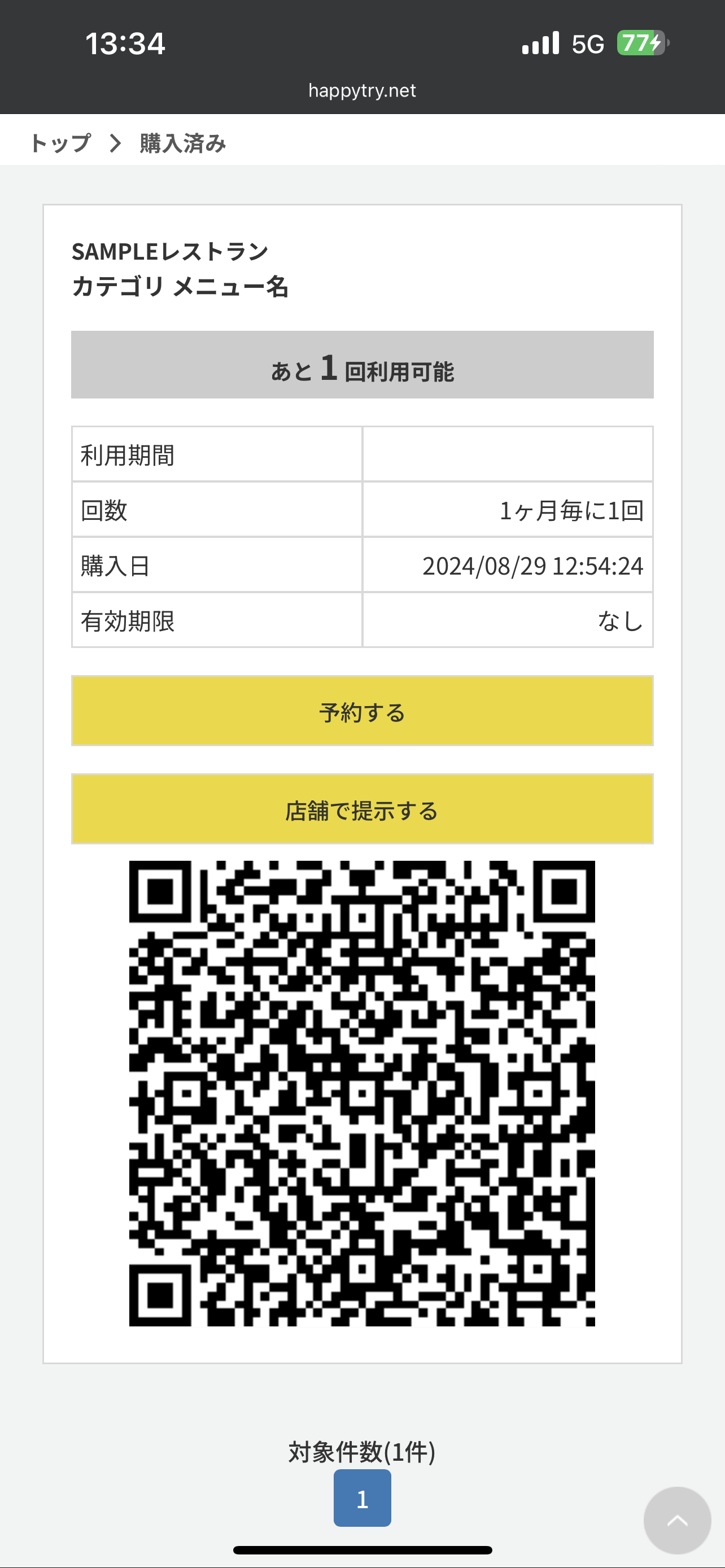 手順:お客様にHappyTryマイページから購入済みを表示していただき、今回使用するサブスクメニューのQRを表示してもらい、お持ちのスマートフォンでQRコードを読み込む