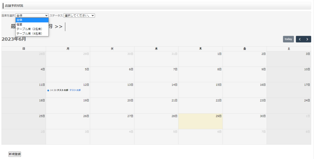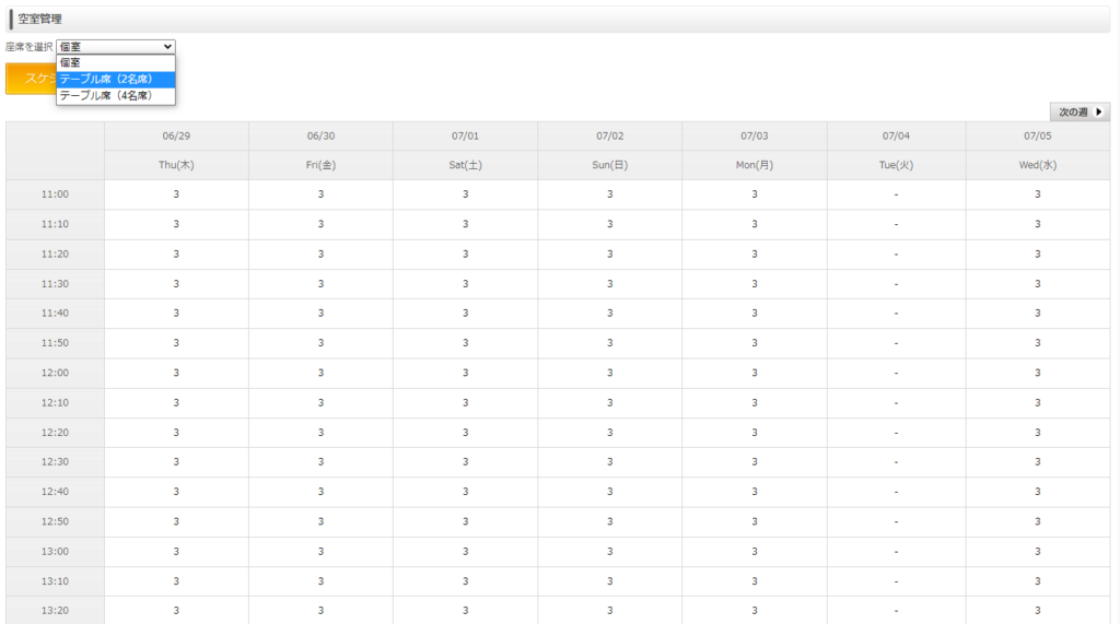 上記の場合、『店舗予約状況』においてそれぞれの席の予約状況を確認することができます。