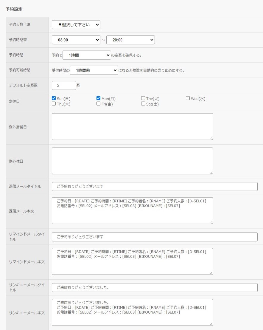 | リマインドメールタイトル | 予約日時の前日、ユーザーに送られるメールのタイトル |