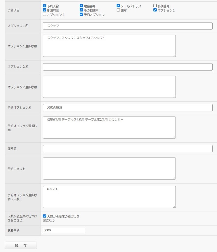 | 予約オプション選択肢郡(人数) | スペースで区切ることにより複数選択肢を入力可能 |