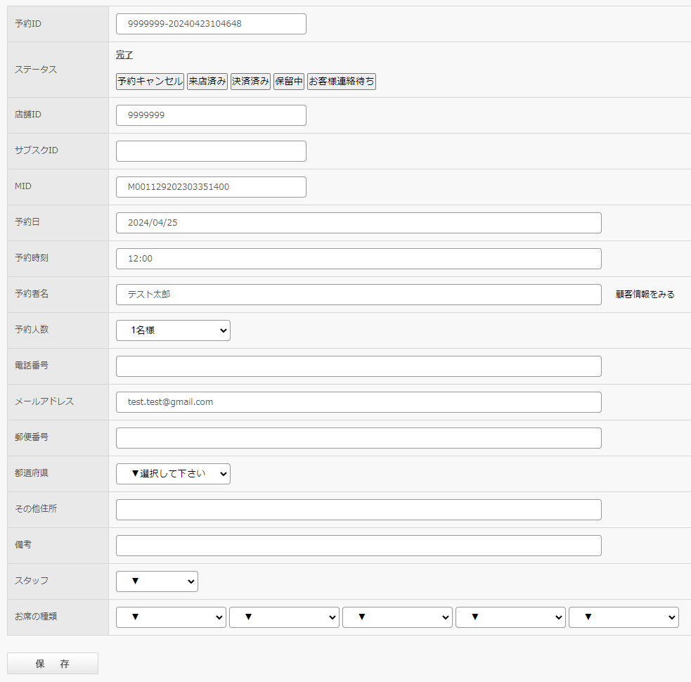 | ステータス | ・予約キャンセル ・来店済み ・決済済み ・保留中 ・お客様連絡待ち ※自動では反映されませんのでご注意ください。 |
