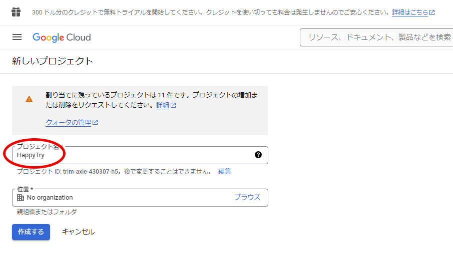 手順②:開かれたページ内のプロジェクト名に「HappyTry」と入力し、作成ボタンをクリック