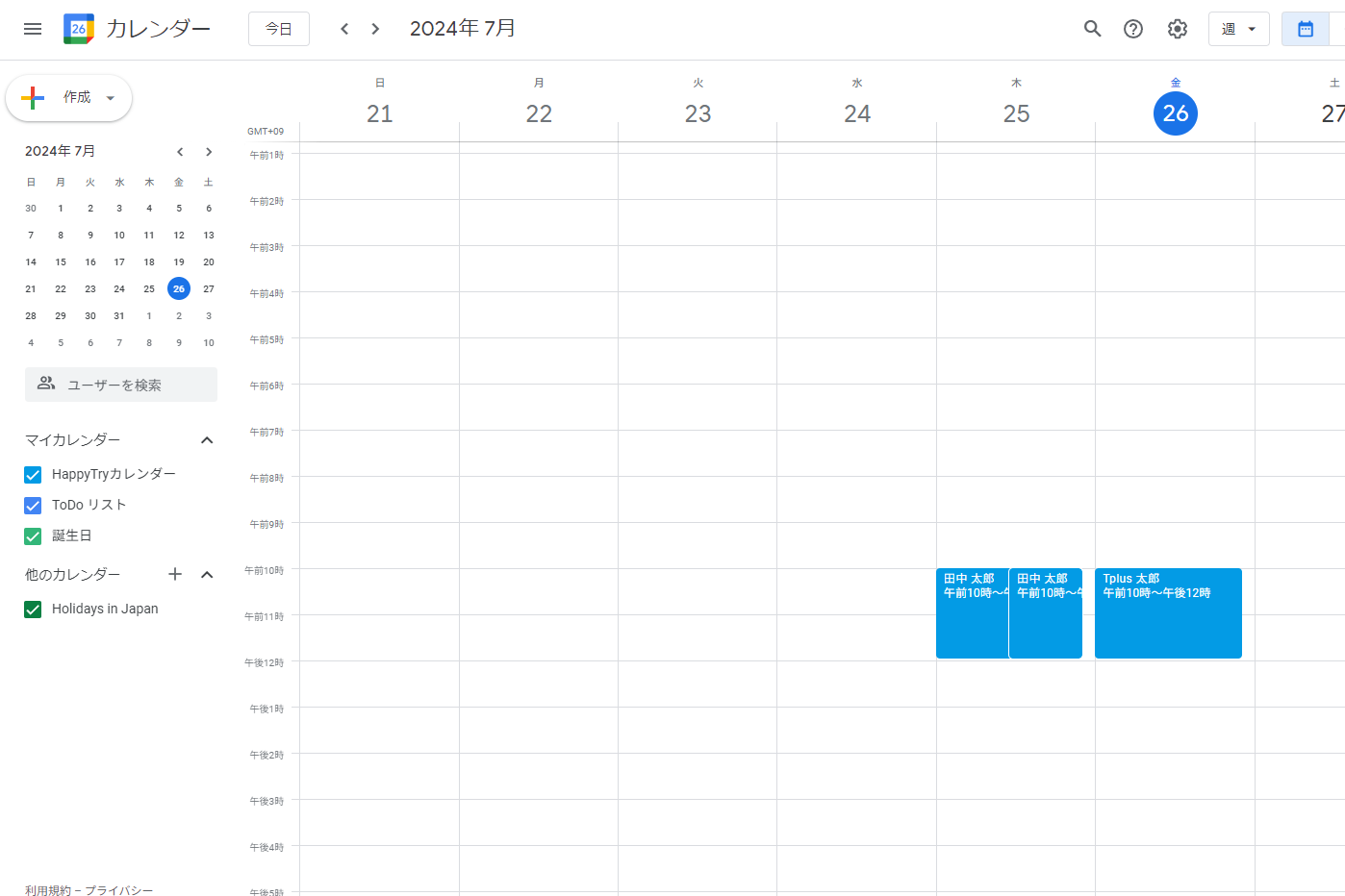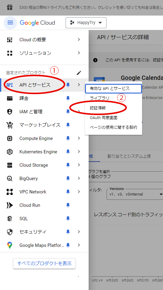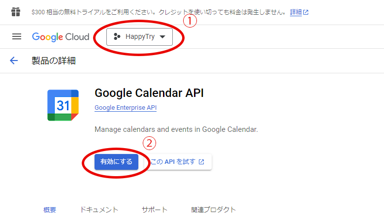 手順④:①がHappyTryになっていることを確認し、Google calendar APIを「有効」にする