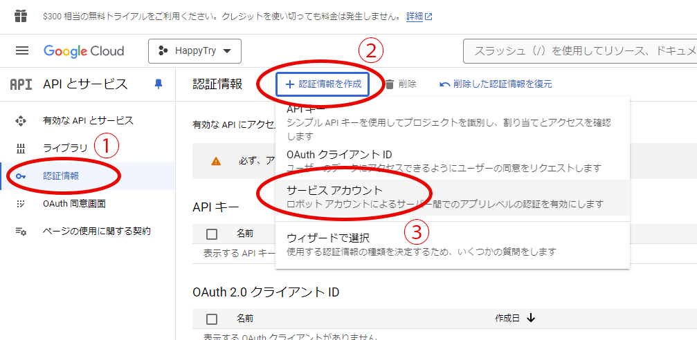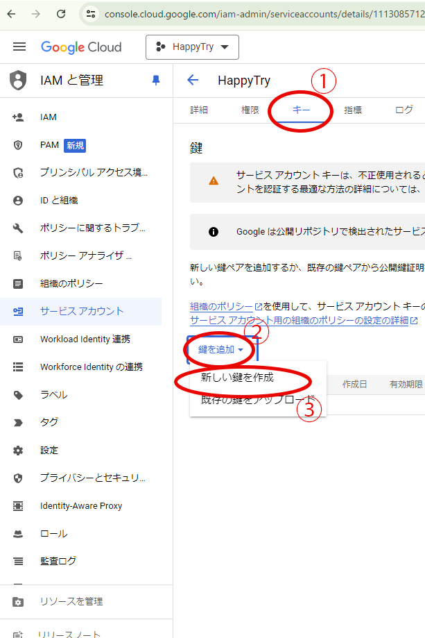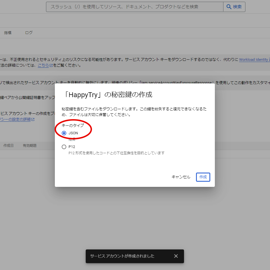 手順⑬:「HappyTry」の秘密鍵の作成からキータイプ「JSON」を選択、作成しダウンロードする。