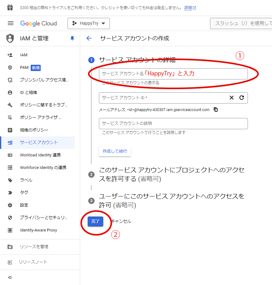 手順⑦:サービスアカウントの詳細に、「サービスアカウント名」を入力する。