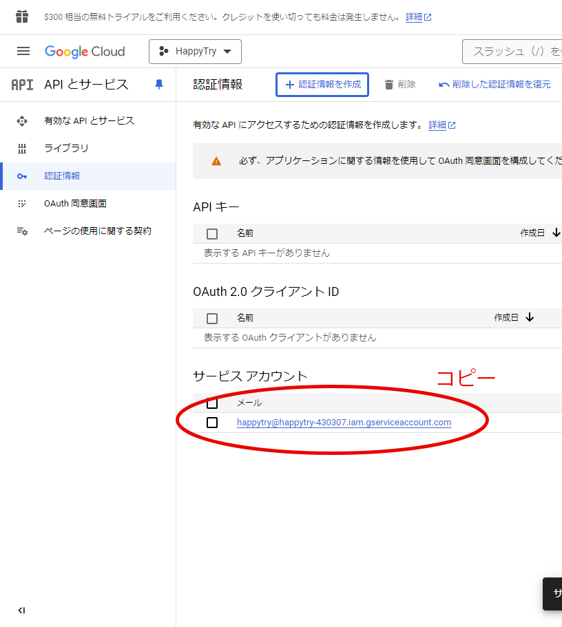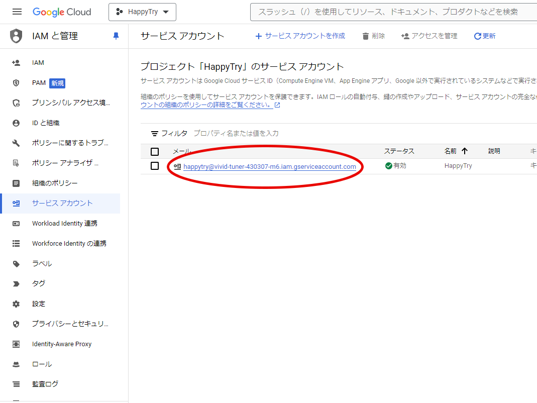 手順⑪:サービスアカウントが開けたら、表示されているメールアドレスをクリック