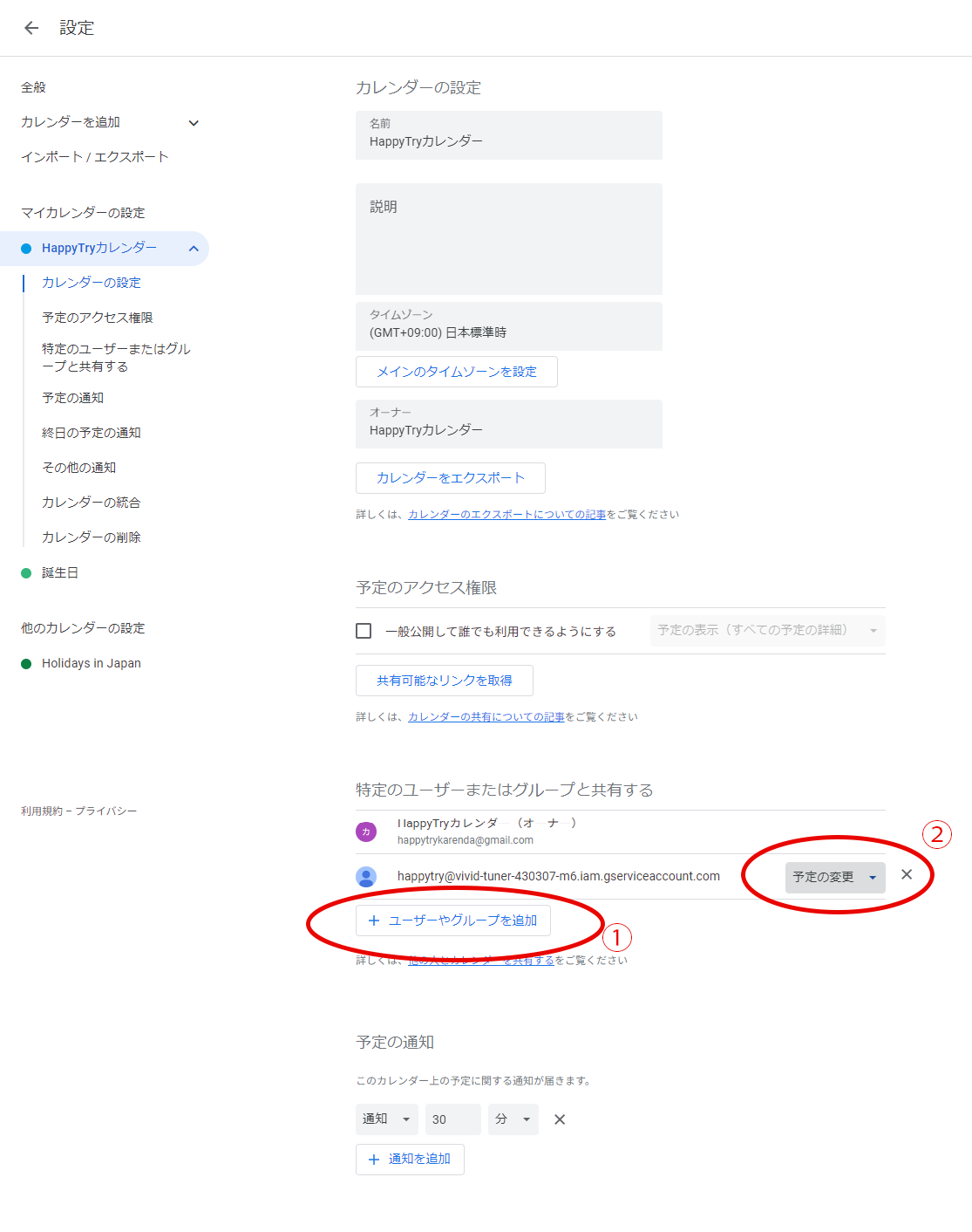 手順⑨:Googleカレンダーの設定を開き、「特定のユーザーまたはグループと共有する」の「ユーザーやグループを追加」をクリックし、先ほどコピーしたメールアドレスとペーストする。※権限は「予定の変更」を選択