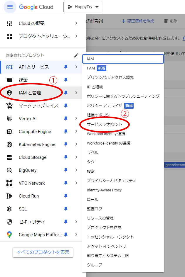 手順⑩:Google cloud のサイドバーを開き、IAMと管理>サービスアカウントを開く