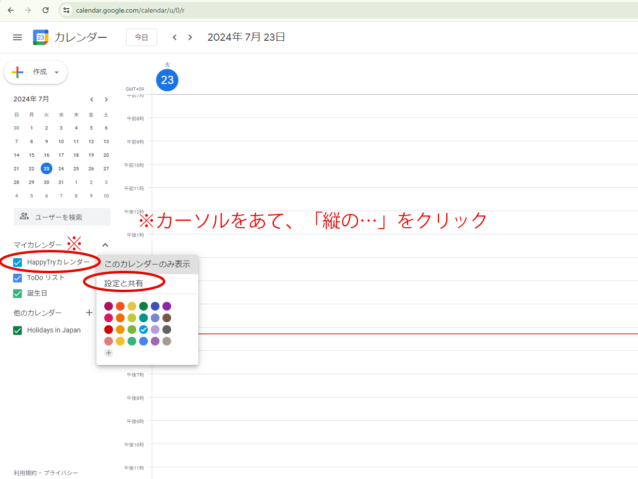 手順⑭:Googleカレンダーを開き、連携先のアカウントにカーソルを合わせて「縦の・・・」をクリック>設定と共有をクリック