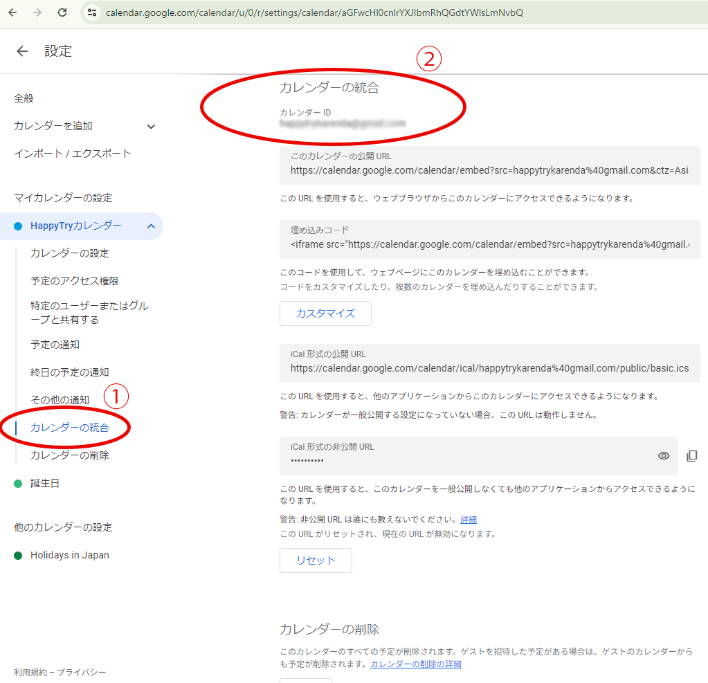 手順⑮:カレンダーの統合に表示されている「カレンダーID」をコピーする