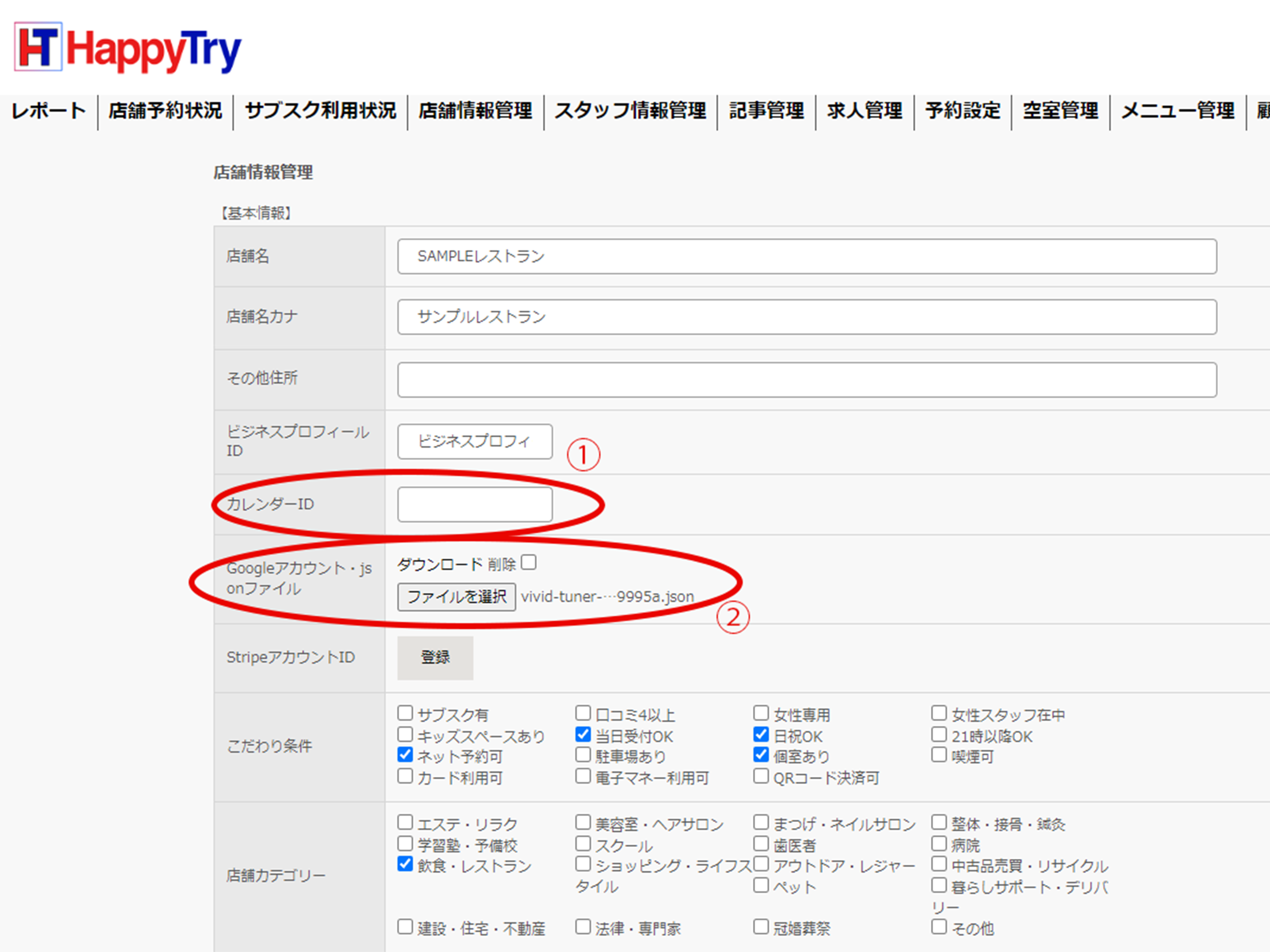 手順⑯:HappyTryのダッシュボード(店舗管理画面)を開き、店舗情報管理の【カレンダーID】に先ほどコピーしたカレンダーIDをペーストする。